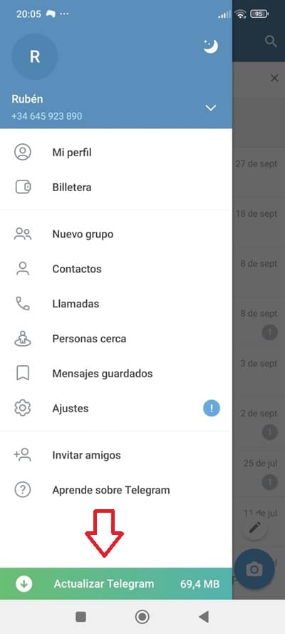 En el menú de Telegram arriba a la izquierda si hacemos clic abajo también nos aparece la opción para Actualizar Telegram